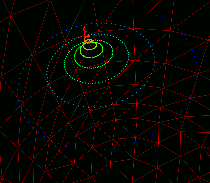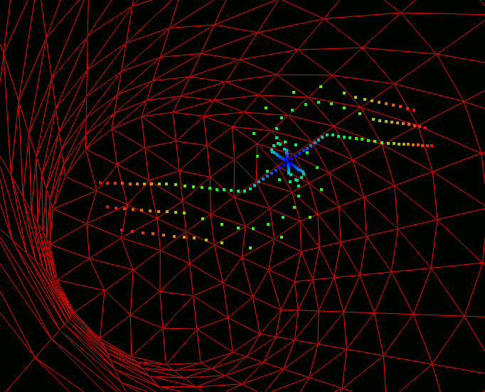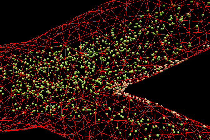 Figures below show the simulated particle dynamics inside the a duct. Deposition of particles on the walls is considered.